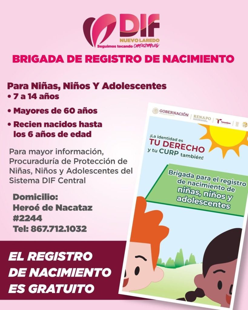 El Sistema para el Desarrollo Integral de la Familia (DIF) invita a la comunidad a participar en la Brigada de Registro de Nacimiento organizada por la Coordinación General del Registro Civil de Tamaulipas.