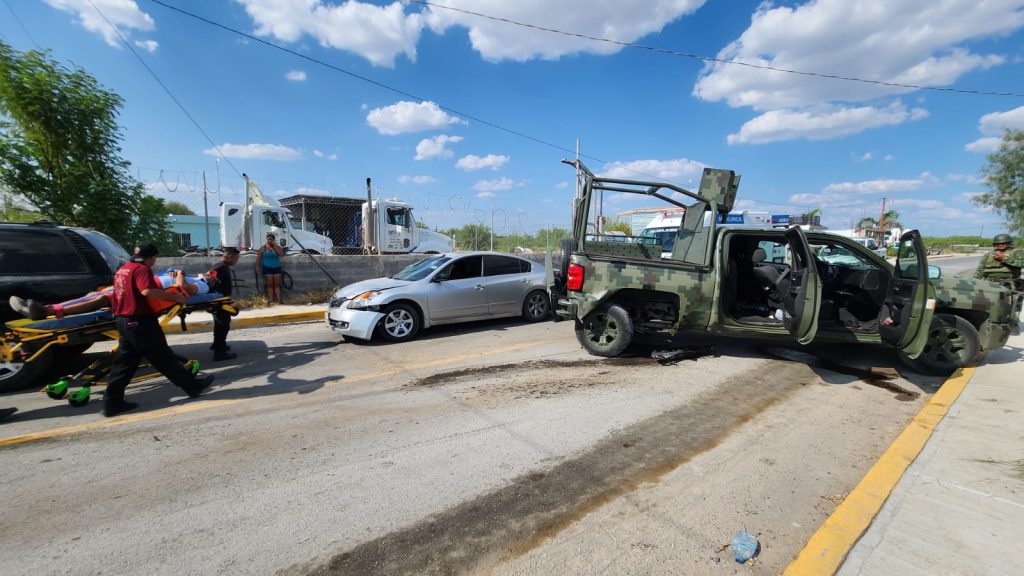 Nuevo Laredo, Tamaulipas, 03 de septiembre de 2023. — Seis heridos, tres de ellos militares, fue el saldo de una colisión, provocada por un soldado que a bordo de una patrulla de la SEDENA se pasó el alto y dañó tres vehículos.