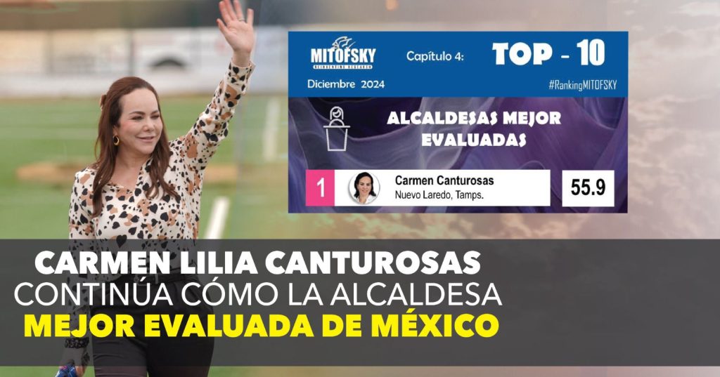 Desde su primera administración, Carmen Lilia Canturosas Villarreal ha mantenido un lugar destacado en el ámbito nacional al ser la mejor alcaldesa evaluada del país; su liderazgo y gestión al frente del Gobierno de Nuevo Laredo han sido reconocidos nuevamente en la más reciente encuesta de la consultora Mitofsky, donde la posiciona como la presidenta municipal con mayor aprobación ciudadana a nivel nacional.