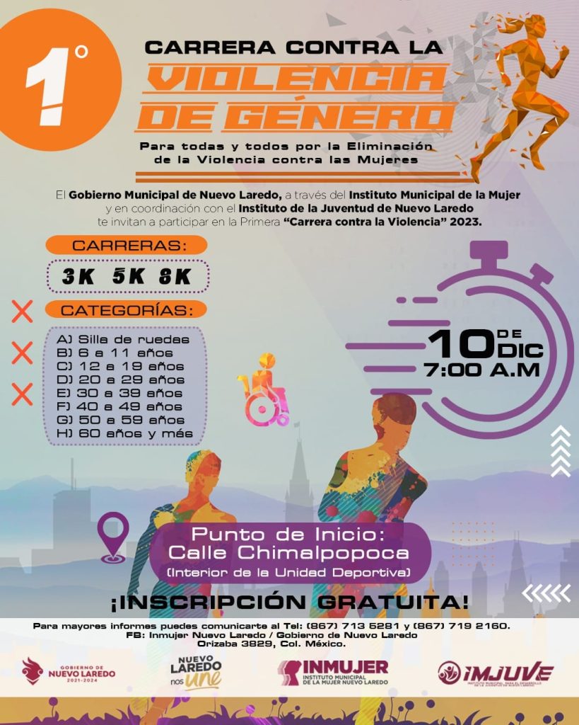 El Instituto Municipal de la Mujer (INMUJER) en coordinación con el Instituto Municipal para el Desarrollo de la Juventud (IMJUVE) llevarán a cabo la “Carrera contra la Violencia 2023” como parte de las actividades de la Cartelera Naranja y los 16 días de Activismo.