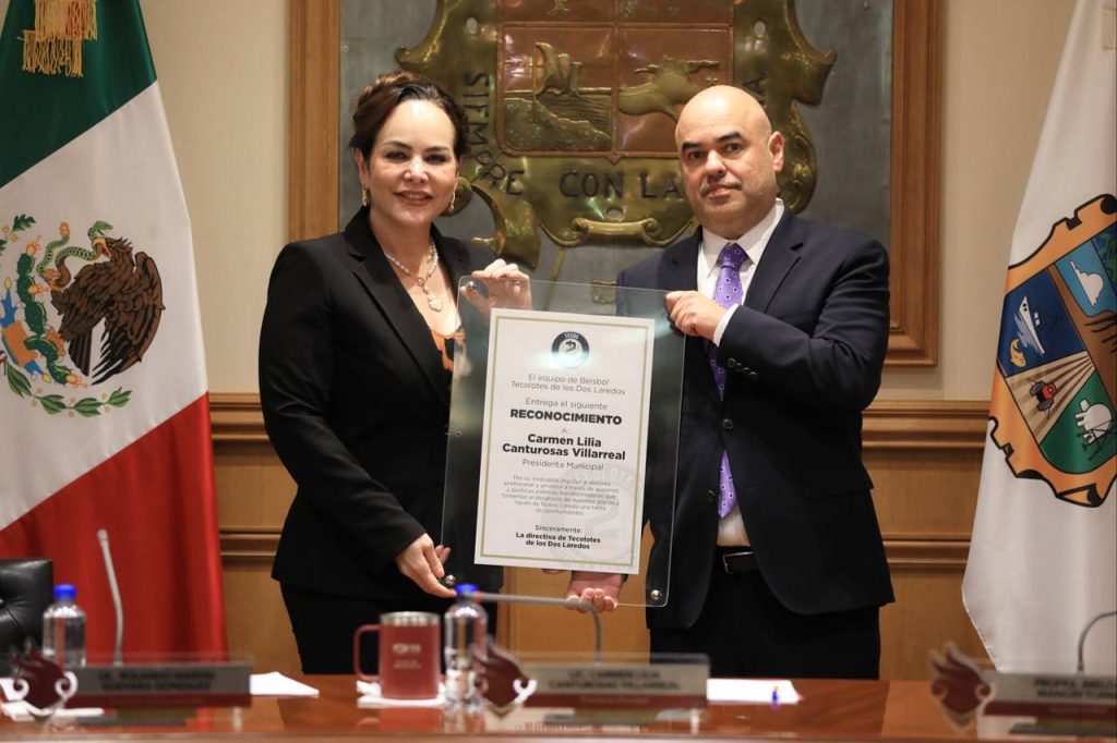 Luego de que el Cabildo de Nuevo Laredo aprobó otorgar en comodato el estadio de béisbol “La Junta” al equipo profesional Tecolotes de los Dos Laredos, el director general de los Tecolotes, Chara Mansur Beltrán entregó un reconocimiento a la presidenta municipal por su apoyo al deporte profesional y amateur en la ciudad.