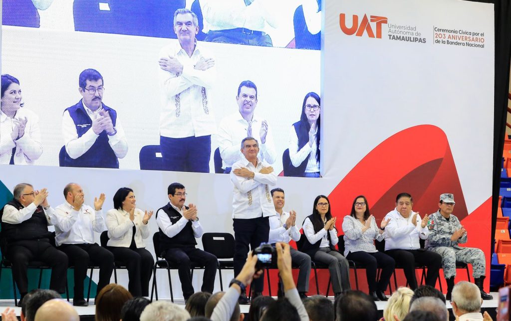Al presidir, junto al rector de la Universidad Autónoma de Tamaulipas, Dámaso Anaya Alvarado, la ceremonia cívica de honores en el Gimnasio Multidisciplinario, el gobernador del estado reiteró todo su apoyo a la UAT para ganar los principales lugares en nivel académico y de compromiso social a nivel nacional.
