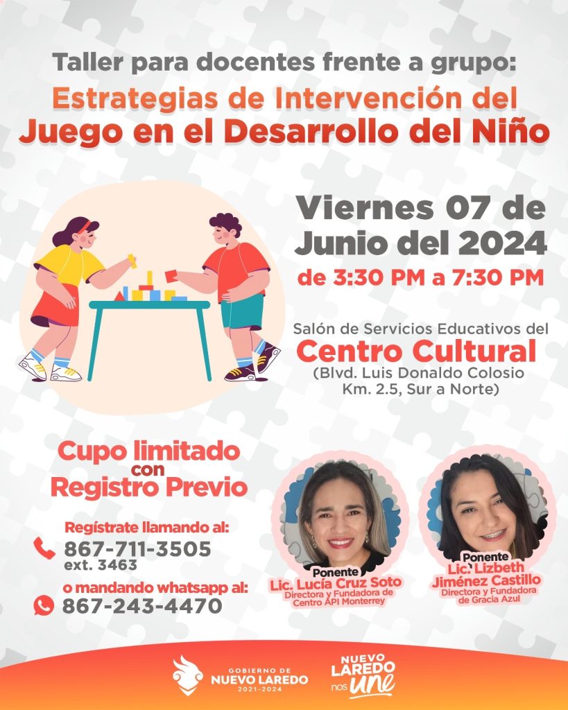 Estos talleres se ofrecerán en el Centro Cultural , en el salón de servicios educativos, siendo el viernes 7 de junio con el tema “Estrategias de intervención en el Desarrollo del niño” y el sábado 8, “Estrategias de intervención en casa II: Integración sensorial”.