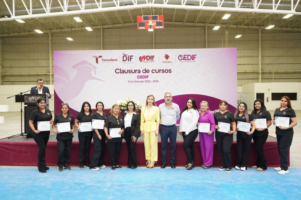Los graduados recibieron certificados que acreditan sus conocimientos, entregados por la presidenta del Sistema DIF, Lic. Claudette Canturosas Villarreal, acompañada por el director general, José Luis Pintado, y la Coordinadora de los CEDIF, Mariela Ortiz Tobías.