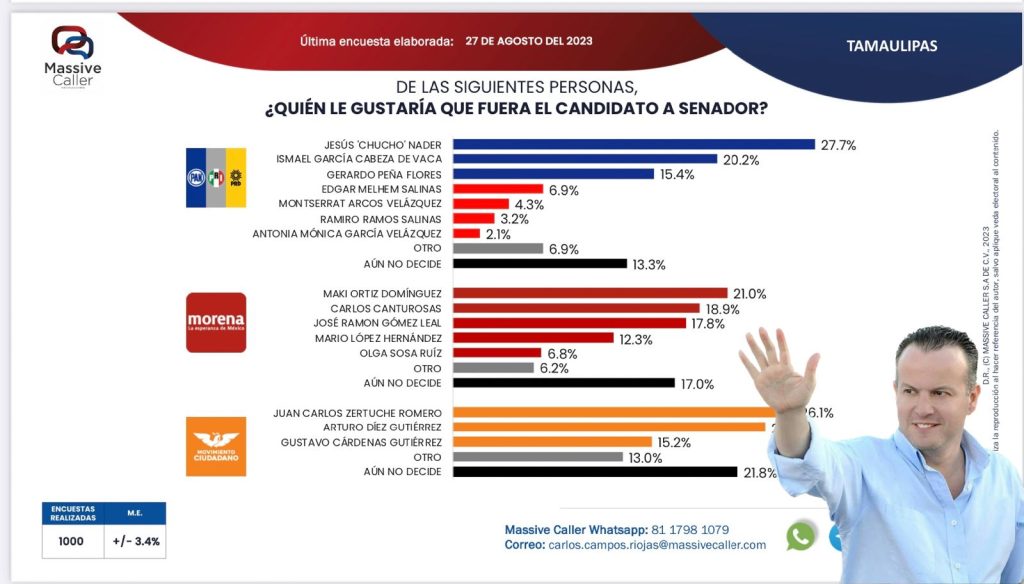 En este ejercicio llamado “Intención de voto para elegir a Senador de la República en Tamaulipas”, coloca al exalcalde de Nuevo Laredo, Carlos Enrique Canturosas Villarreal con un 18.9 por ciento de las preferencias como uno de los favoritos para ser el candidato.