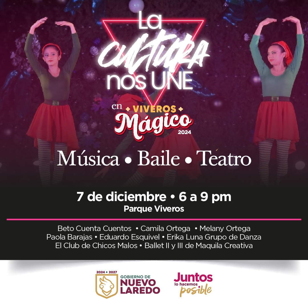 Como parte de la agenda navideña del Gobierno Municipal, este sábado 7 de diciembre los neolaredenses podrán disfrutar de música, baile, teatro durante el evento “La Cultura Nos Une” en el Viveros Mágico dentro del Parque Viveros.