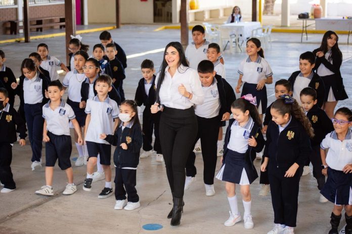 La Alcaldesa fue recibida por el Director del plantel educativo Alejandro Alberto Ortega Rodríguez, docentes y alumnos, y participó con ellos en dinámicas de ejercicios con música como parte de la promoción de la buena alimentación.