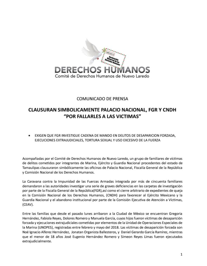 Otros manifestantes que participaron en la clausura simbólica del Palacio Nacional, Fiscalía General de la República y Comisión Nacional de los Derechos Humanos son familiares de cinco hombres detenidos, sometidos y ejecutados extrajudicialmente frente a la barda perimetral de un centro comercial en Nuevo Laredo ocurrida el pasado 18 de mayo. Los hechos fueron evidenciados a través de un video difundido en medios de comunicación internacionales y nacionales, los cuales fueron grabados por una cámara de seguridad, misma que mostró el momento exacto en el que fueron asesinados mediante la actuación arbitraria de un grupo de militares de Operaciones Especiales de la Secretaría de la Defensa Nacional.