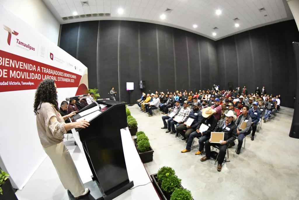 La secretaria del Trabajo y Previsión Social, Olga Patricia Sosa Ruíz, dio la bienvenida a los trabajadores que cumplieron con su encomienda y recordó cuando les hizo entrega de los documentos de movilidad laboral para lograr estancias seguras y legales, lo que les ha permitido brindar mejores condiciones de vida para sus familias, refrendando que la mano de obra tamaulipeca trasciende fronteras por su entrega y disciplina.