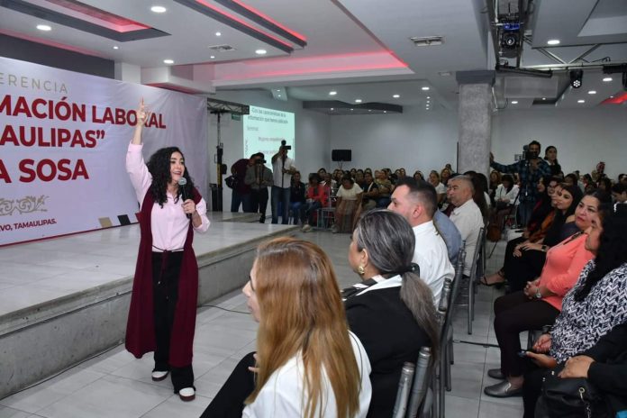 Río Bravo, Tamaulipas.- Con la presencia de la señora Malena Rodela de Villegas y del presidente municipal, Joel Eduardo Yáñez Villegas y ante un auditorio repleto de mujeres de esta ciudad fronteriza, la secretaria del Trabajo y Previsión Social del gobierno de Américo Villarreal Anaya, brindó una conferencia acerca de la transformación del mundo laboral, con el propósito de dar a conocer a las mujeres jefas de familia, los beneficios que ha traído consigo la reforma laboral impulsada por el presidente Andrés Manuel López Obrador.