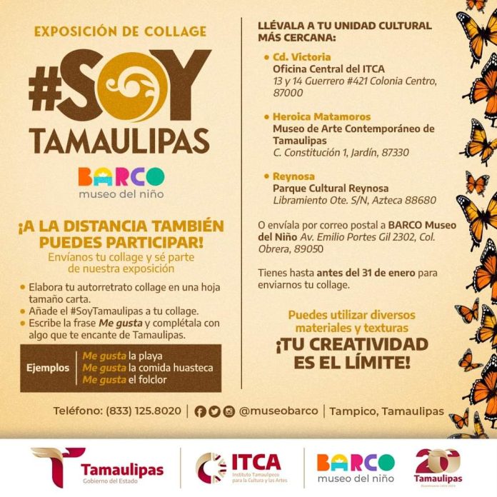 Ciudad Victoria, Tamaulipas. – El Instituto Tamaulipeco para la Cultura y las Artes (ITCA), en colaboración con el Barco Museo del Niño, invita a la comunidad a participar en la Exposición de Collage #SoyTamaulipas, una iniciativa que fusiona la creatividad con el amor por nuestra hermosa tierra.