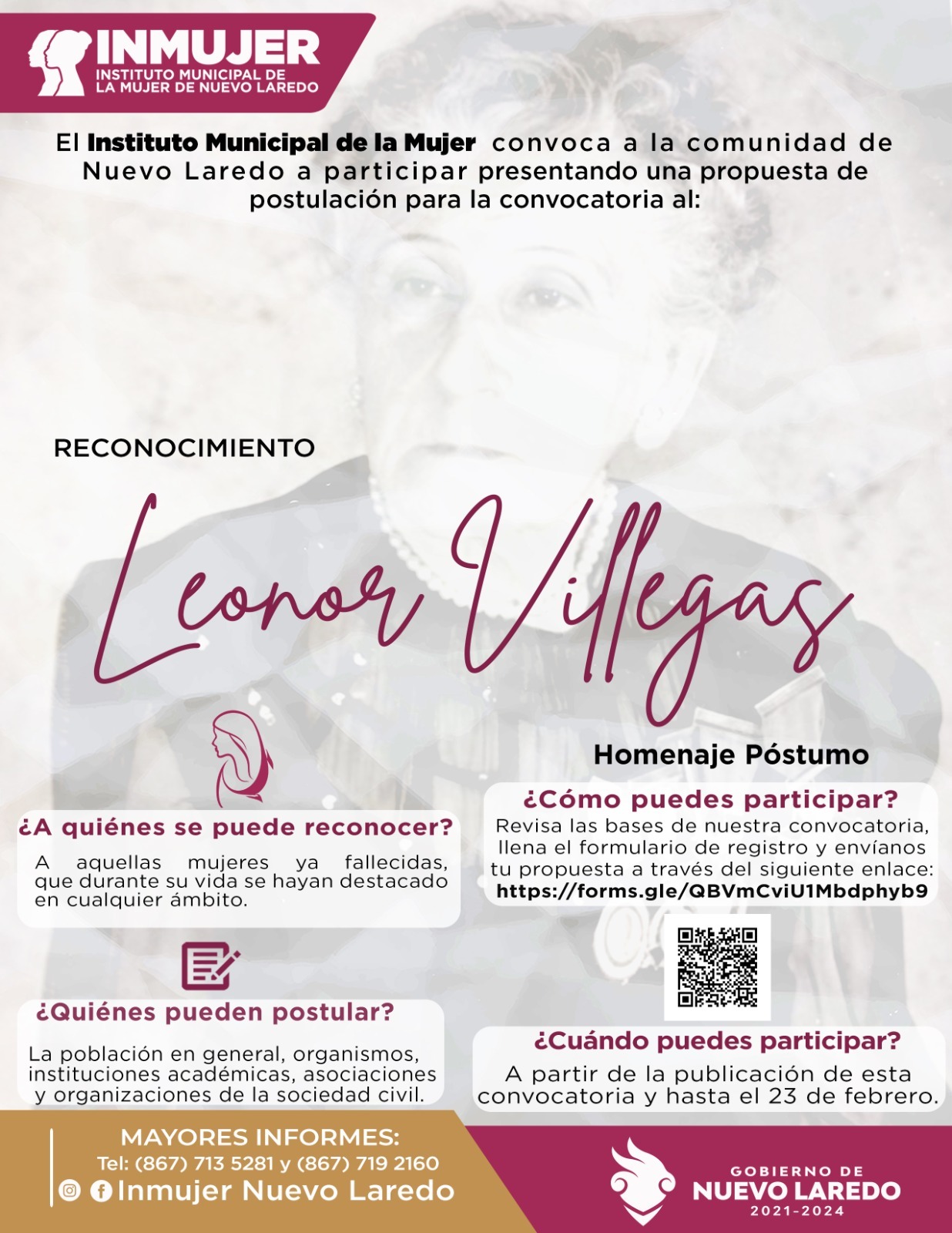 El Instituto Municipal de la Mujer de Nuevo Laredo lanzó la convocatoria “Leonor Villegas” Homenaje Póstumo, con el cual se busca reconocer el legado y visibilizar las acciones que las mujeres han dejado como parte de la historia de nuestra ciudad.