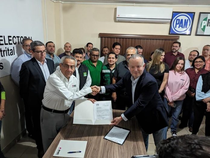 El registro de Canturosas Villarreal se llevó a cabo en las instalaciones del INE en Nuevo Laredo ante la presencia de medios de comunicación que ya esperaban al ahora candidato.