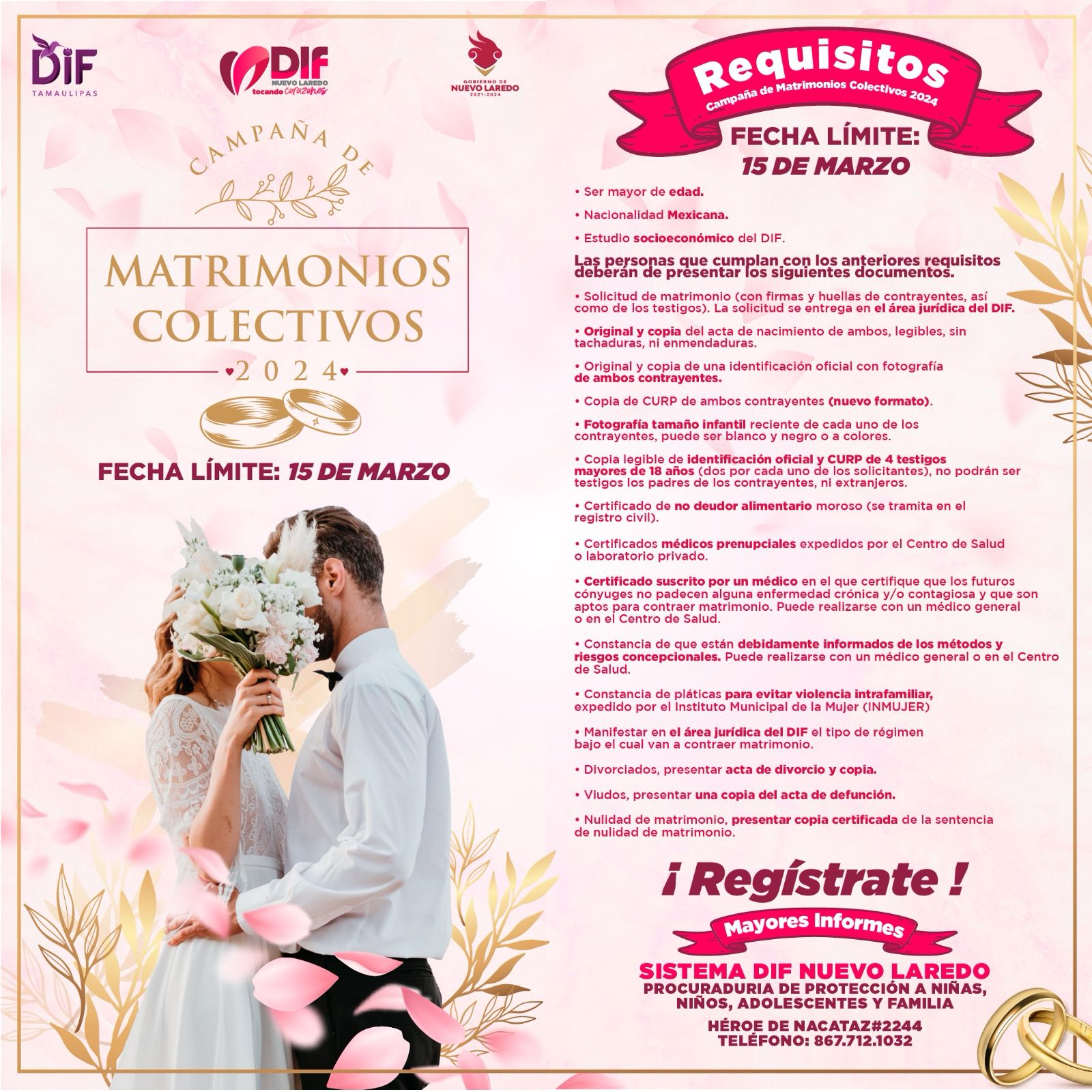 El Sistema para el Desarrollo Integral de la Familia (DIF) informa que será el próximo 15 de marzo la fecha límite que tienen las parejas para beneficiarse con la Campaña de Matrimonios Colectivos 2024.