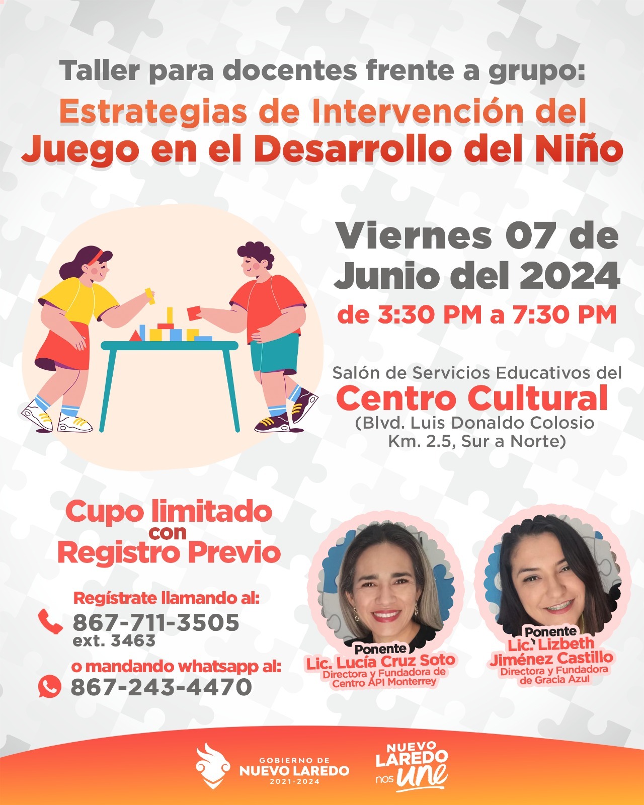 Estos talleres se ofrecerán en el Centro Cultural , en el salón de servicios educativos, siendo el viernes 7 de junio con el tema “Estrategias de intervención en el Desarrollo del niño” y el sábado 8, “Estrategias de intervención en casa II: Integración sensorial”.