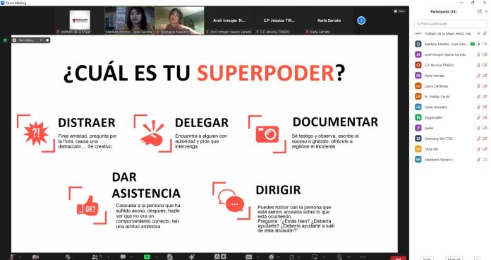 Marlenne Montes, fue la encargada de brindar esta capacitación online, la cual luego de presentar estadísticas de cómo se vive el acoso callejero en México y las repercusiones que este genera, presentó unas herramientas que permiten a las mujeres reaccionar ante una situación de riesgo en la calle.