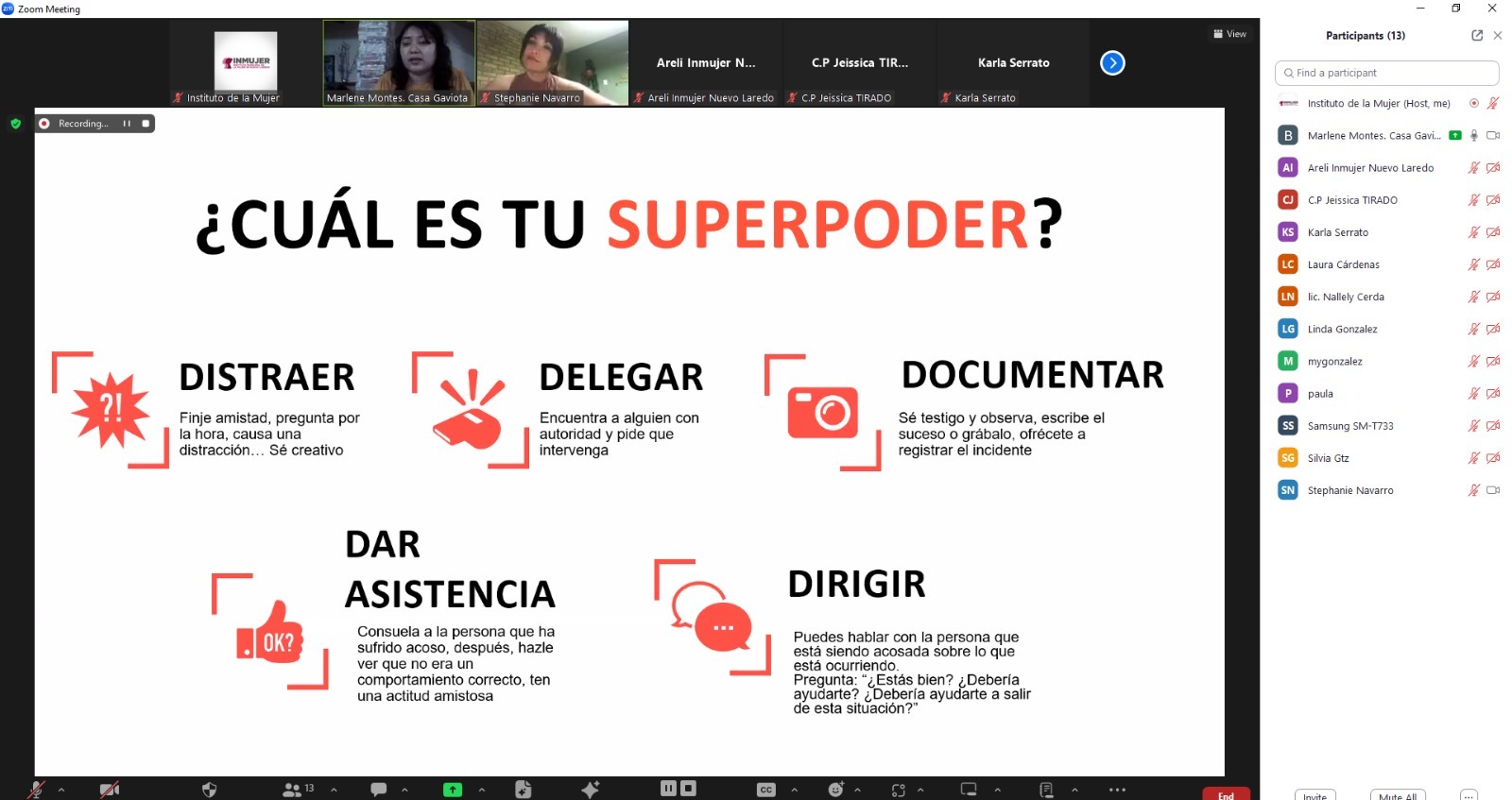 El Instituto Municipal de la Mujer de Nuevo Laredo, realizó el curso “Stand Up: Adquiere herramientas para intervenir en una situación de acoso callejero” esto en colaboración con la asociación civil Casa Violeta y L’Oreal Paris, quienes han lanzado esta campaña para crear espacios seguros para mujeres y niñas.