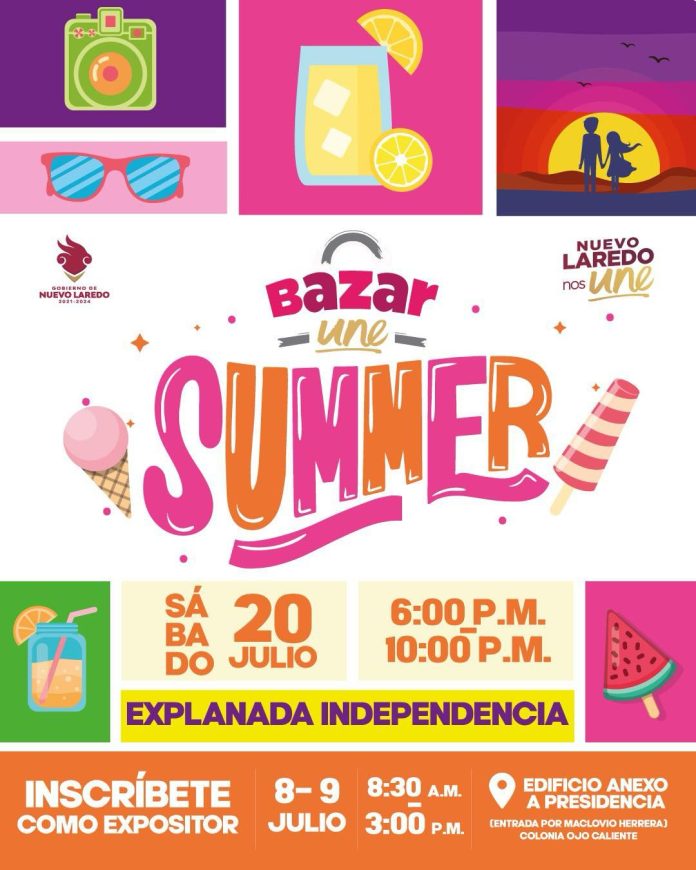 El Gobierno Municipal, a través de la Secretaría de Bienestar, invita a emprendedores neolaredenses a inscribirse en el Bazar UNE “SUMMER” que se realizará el sábado 20 de julio en la Explanada de la Independencia en horario de las 6:00 a las 10:00 PM.