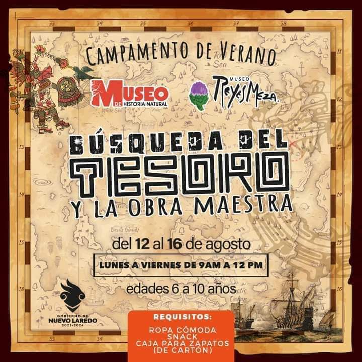 La Dirección de Arte y Cultura ofrecerá un campamento de verano en el Centro Cultural denominado “Búsqueda del Tesoro y la Obra Maestra” en el que niñas y niños podrán aprender sobre datos históricos de México, origen de los museos, arqueología y más.