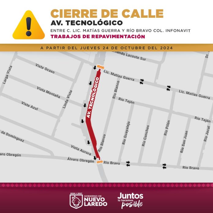 Debido a trabajos de repavimentación, a partir de este jueves 24 de octubre se cerrará a la circulación la avenida Tecnológico, entre Matías Romero y Río Bravo en la colonia Infonavit.