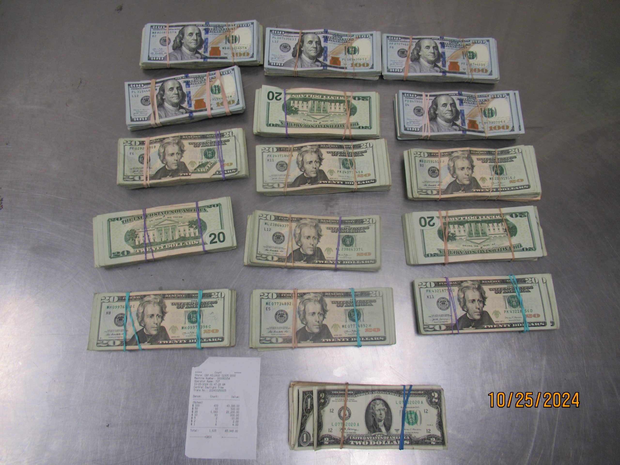 Una inspección física del vehículo dio como resultado el descubrimiento de cinco paquetes ocultos en el interior del vehículo, lo que dio lugar a la incautación de un total de 65.948 dólares en dinero no declarado.
